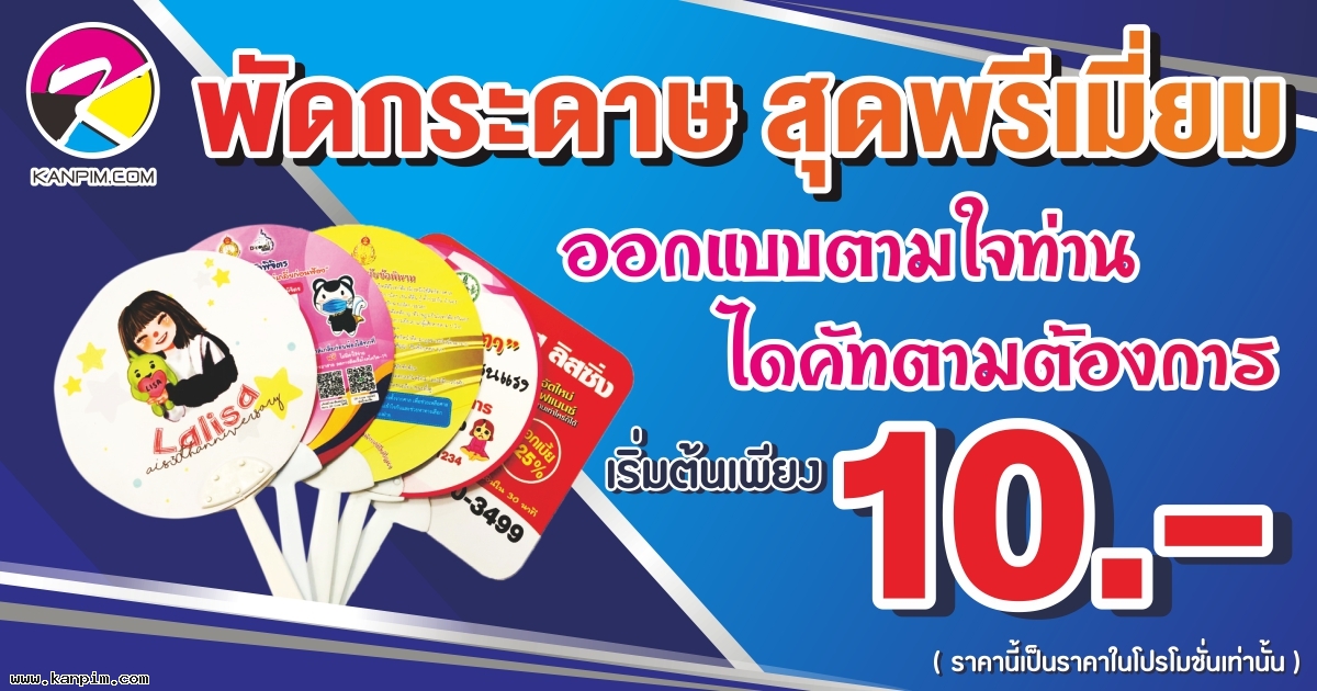 พัดกระดาษพร้อมด้ามจับ กระดาษอาร์ต 400 แกรม พิมพ์ 4 สี 2 ด้าน เคลือบลามิเนต ไดคัทพร้อมใส่ด้ามจับพลาสติก