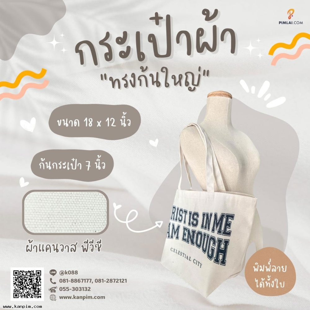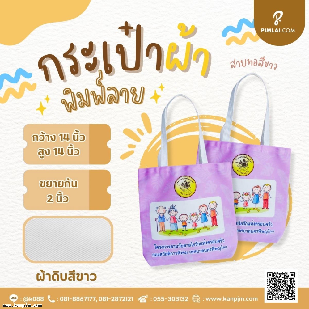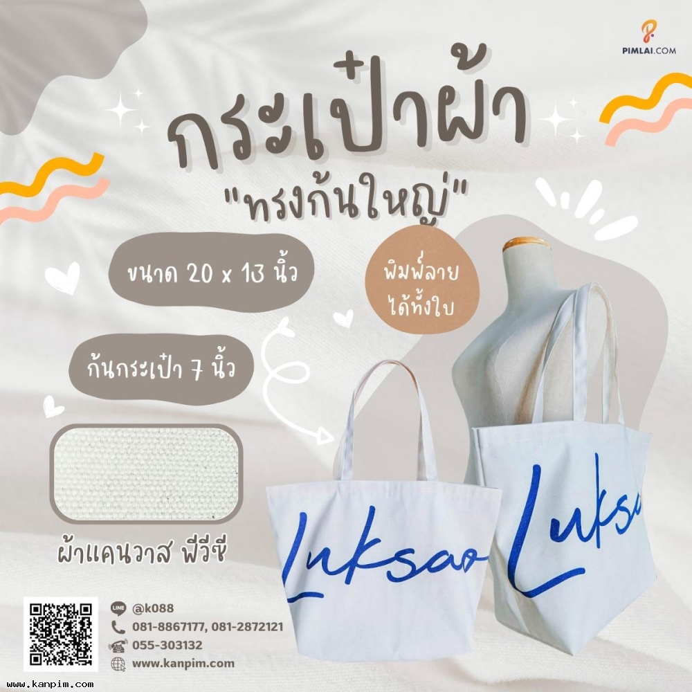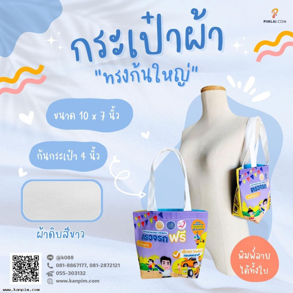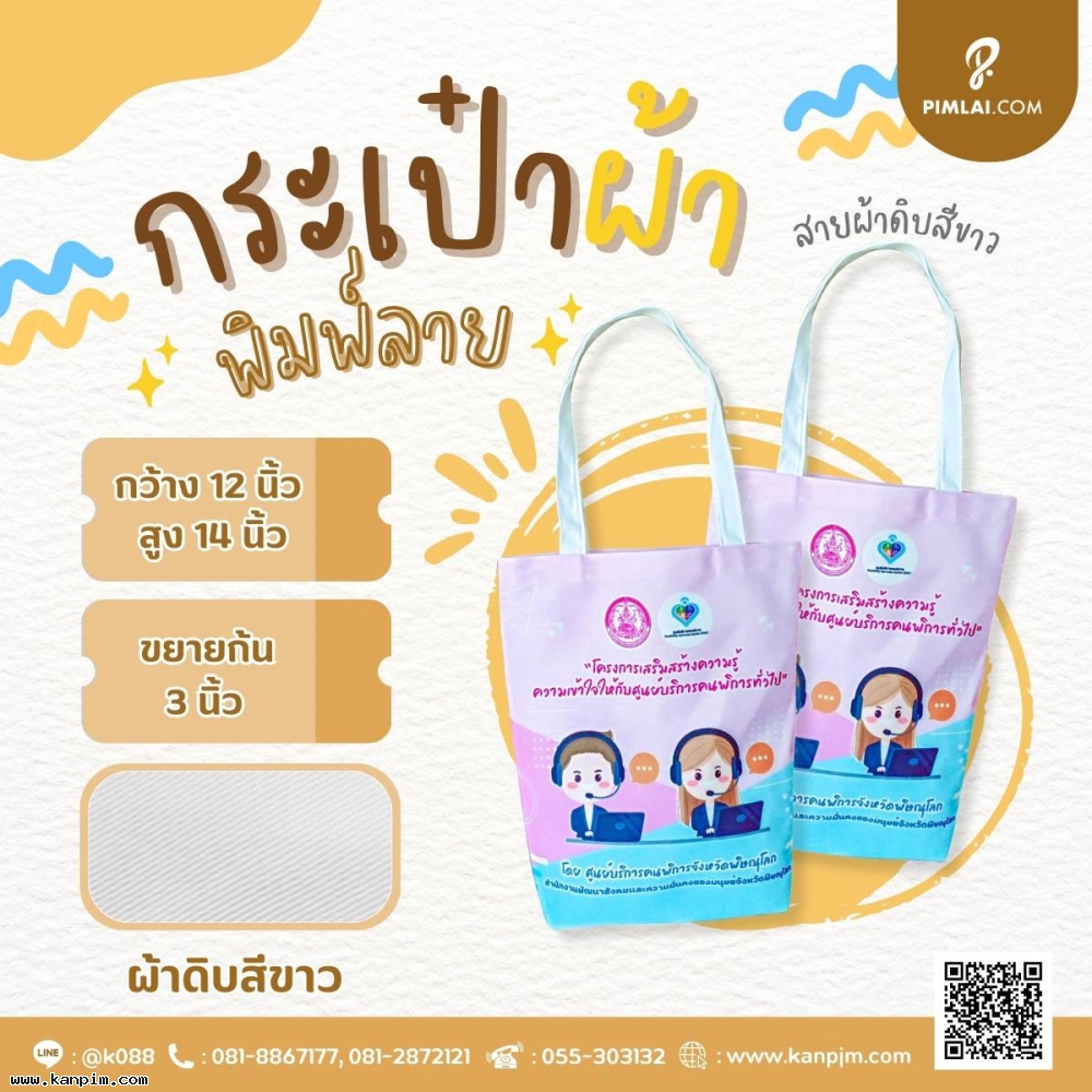 ถุงผ้าดิบลายสอง ราคาไม่แพง พิมพ์ลายให้ทั้งใบ ลวดลายตามใจคุณ จะออกแบบมาเอง หรือส่งรูปส่งข้อความมาให้เราช่วยออกแบบให้ก็ไม่ว่ากัน 20 ใบ 30 ใบ เราก็ผลิตให้ สั่งเยอะหน่อยไม่คิดค่าแบบ