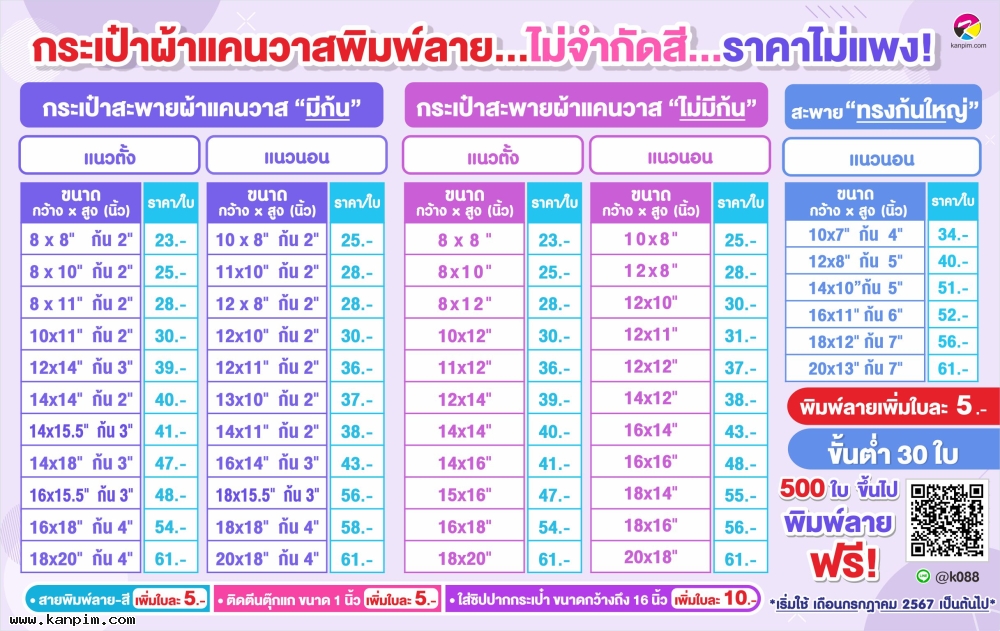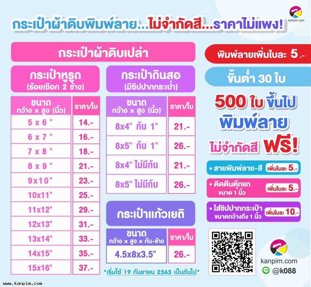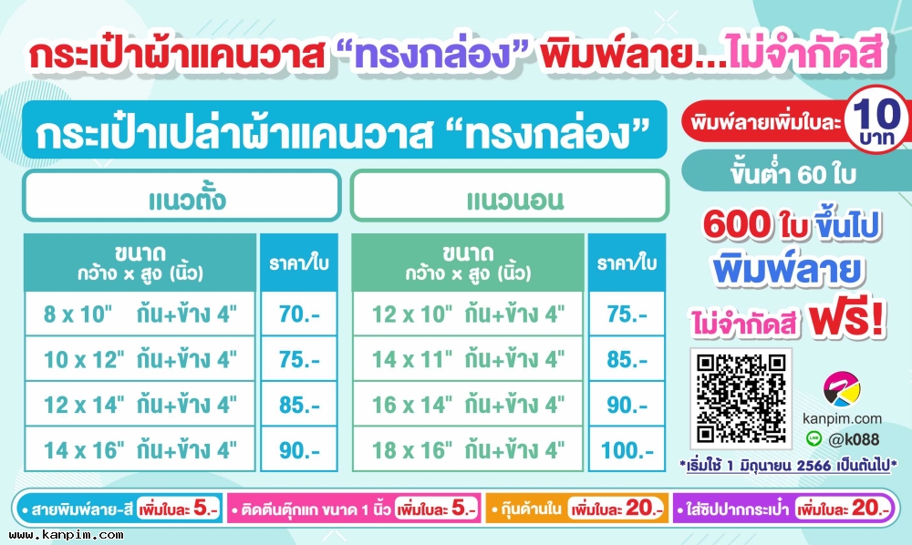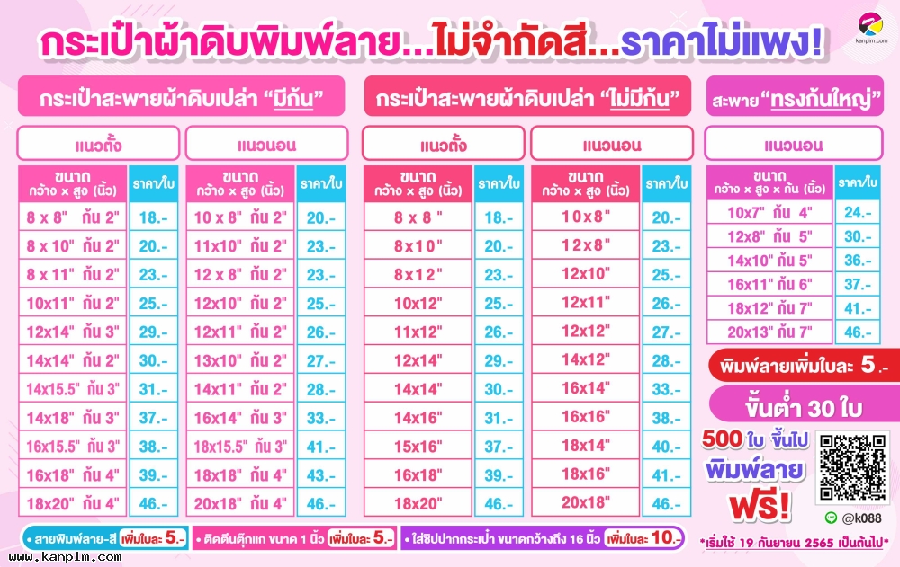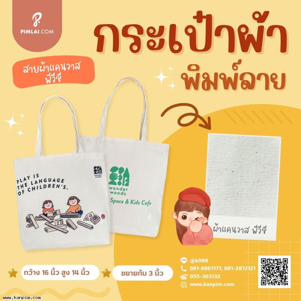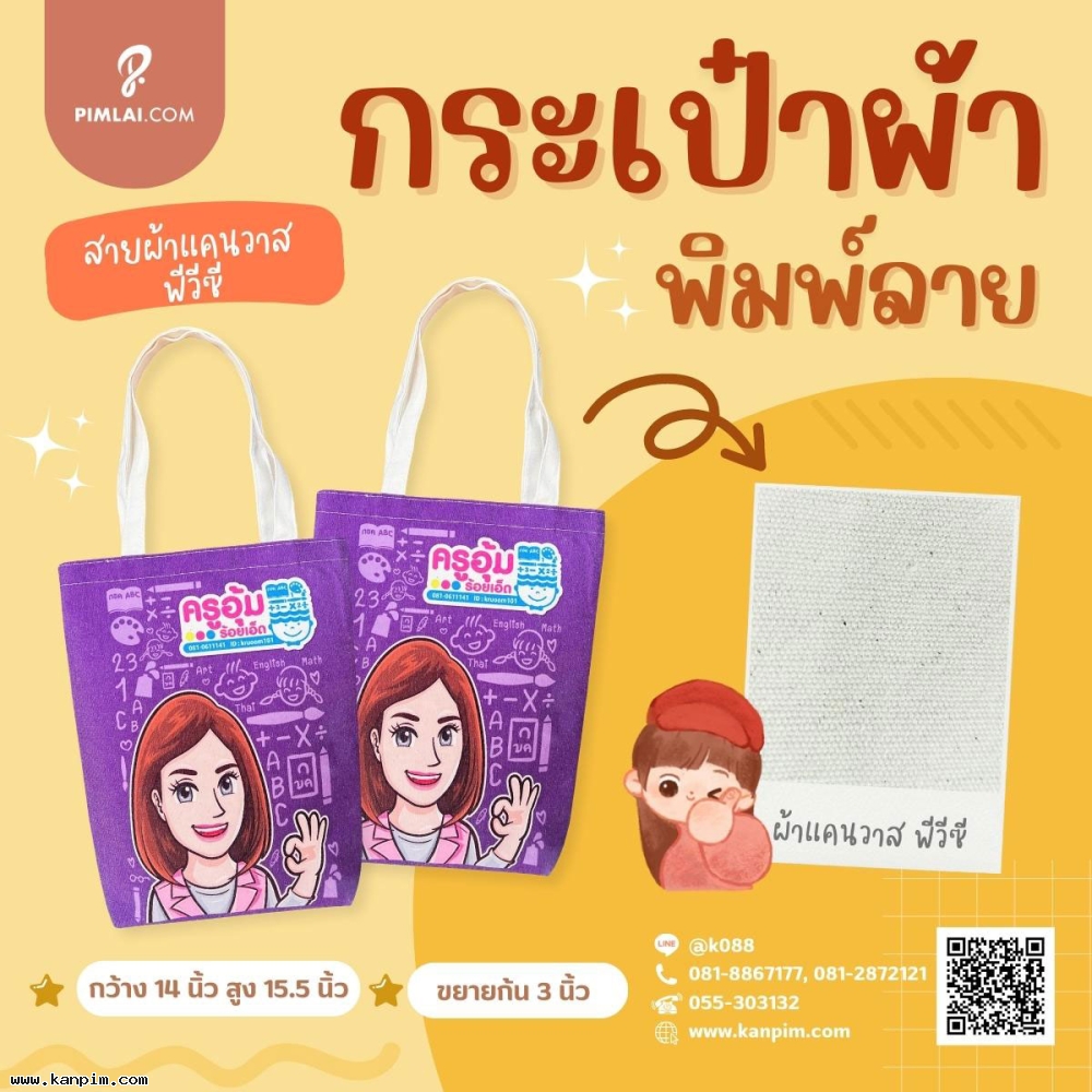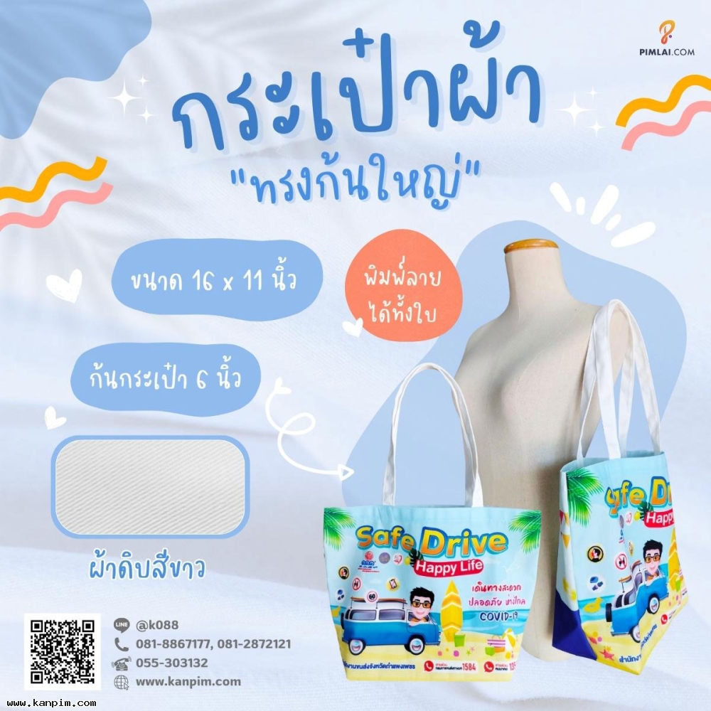 ถุงผ้าดิบลายสอง ราคาไม่แพง พิมพ์ลายให้ทั้งใบ ลวดลายตามใจคุณ จะออกแบบมาเอง หรือส่งรูปส่งข้อความมาให้เราช่วยออกแบบให้ก็ไม่ว่ากัน 20 ใบ 30 ใบ เราก็ผลิตให้ สั่งเยอะหน่อยไม่คิดค่าแบบ
