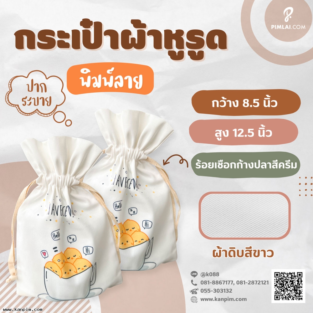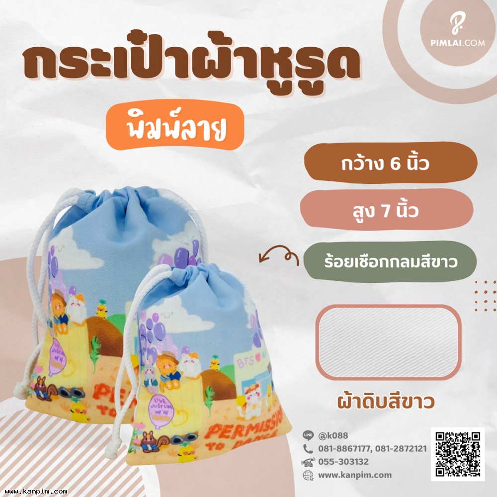 กระเป๋าผ้าหูรูด ถุงผ้าหูรูด สีสรรค์สวยงาม ออกแบบตามใจคุณ เหมาะสำหรับใส่ของมอบให้กับคนที่เรารัก หรือใส่ของฝากแทนใจ หรือเป็นถุงใบใหญ่ สำหรับใส่ของบริจากผู้ประสบภัยต่างๆ ถุงผู้ประสบภัย ถุงยังชีพ กำหนดขนาดมา เราผลิตให้คุณได้ทั้งหมด